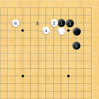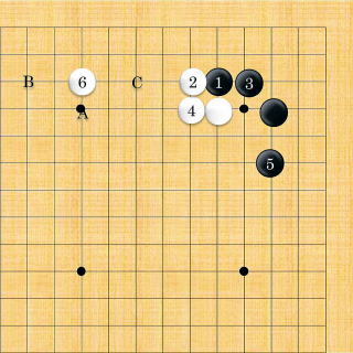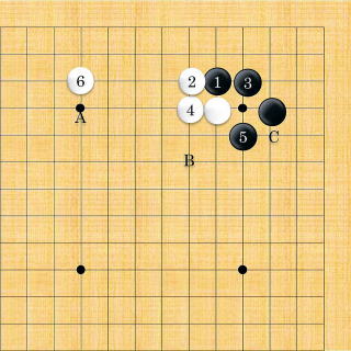 | 白も6にヒラいて一段落する。白Aもある。二立三析の形になって落ち着くことになる。黒は位は低いが隅が味良く地になっており、また黒からはBとツメて打ち込みを狙う手がある。 |