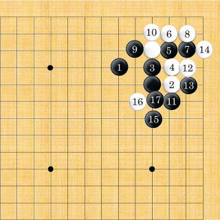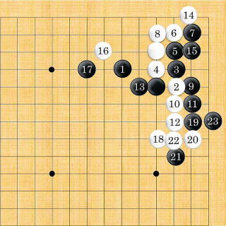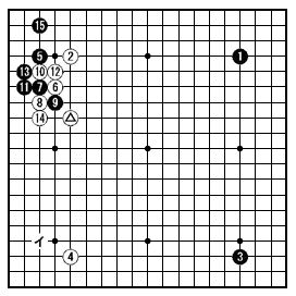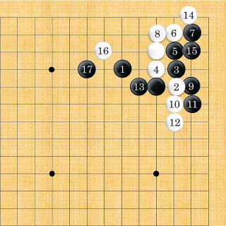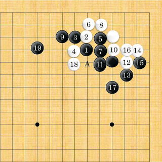 | 指了図。黒は愚形にツイでおけば右辺はかえって固まる調子がつく。黒19まで、主に上辺が焦点となる戦いに向かうことになる。 |