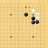 | ツギ。これで隅は生きており双方一段落する。 この後、黒からはAの利かし、Bのトビ込み狙いなどが大きい。白からもBのスベリが計算外の大きさである。 |