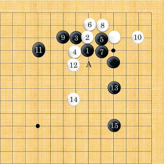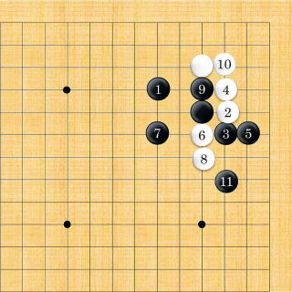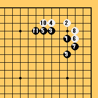 | 指了図。黒7のトビが形。白のノビには黒はアテコミを利かしつがせて11とトンでこれからの戦い。部分的には黒のやれる戦いで、白は挑発に乗った感がある。 |