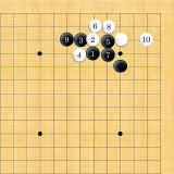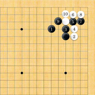 | 指了図。白10と黒を固めず隅を生きれば、双方、中央に進出して戦いとなる。 |
