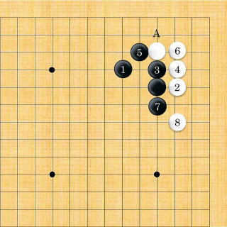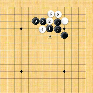| 指了図。白6とツゲば普通である。Aのサガリは地にカラい打ち方だが右辺をハネられて不利になる。共に穏やかな進行で互角のワカレである。 |