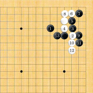 | ヒキノビ。シチョウと白11のツギを見合いにする簡明な打ち方である。 |