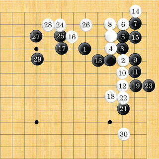 | 指了図。黒は19−25と隅を生きなければならず、それから上辺に手を戻す。白も上辺を生きた後に右辺にヒラいて一段落する。 |