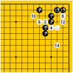 | 黒3、5と出切る定石である。黒13、白14までの分かれとなる。 |