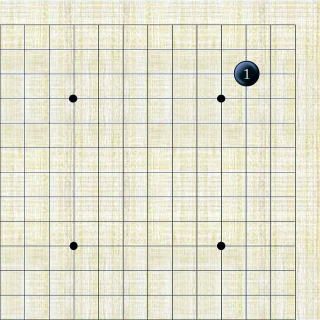 碁盤の隅の縦横3線が交わった場所に打つ手を三三(打ち)と云う。19路盤には全部で4ヶ所ある。隅の地を囲い易いが中央の影響力が弱いと云う欠点がある。 |