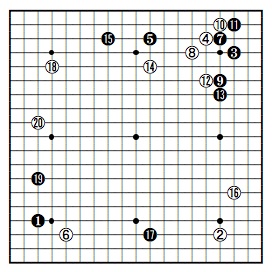 | めったにコスミを打たない道策名人がなぜ白8と打ったのでしょうか? 力を溜めておいて2の石を動き出すぞ、という趣旨でして黒は9と受けています。 | |
