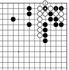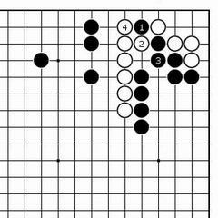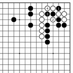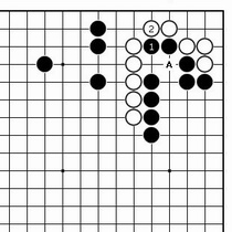 黒1ハネダシ。白2から4と打たれて失敗です。逃げた黒石2子と黒1の1子は、どちらかが見合いで取られている。