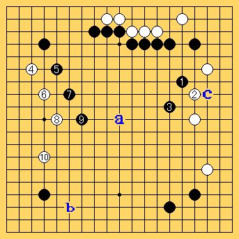 黒1から白10まで。この後、黒aと囲っても白bぐらいに打たれたら黒必敗。