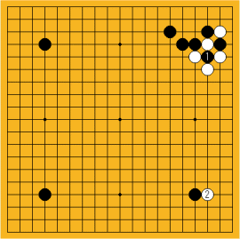 | コウ(こう)とは、お互いに何度でも石を取り返せる形。そのままでは一生続いてしまうので一度他の場所に打ってからでないと取り返すことができない。 | ||||||
