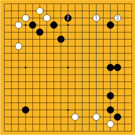 黒2/一間受け。白3/二間トビ。左上の黒四子が孤立してとっても嫌な感じ。