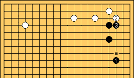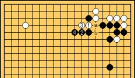 | 白1/ワリコミ。黒は3にアテたくなるところだが、白aと黒bの交換が約束されているので危ない。だからアテず黒2/ノビ、白3/デにも黒4/ノビが良い。こう打てば前図と同じことになり黒良しになる。 | |