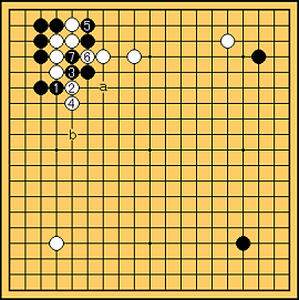 /ハネダシ。 /キリ。 /ノビ。 /サガリ。白6/出。黒7/キリ。シチョウは黒有利だから白が取られている。もしシチョウが不利でも でaと打てば白はbと打つことができず黒有利! |