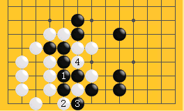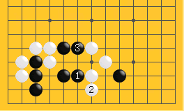 白は2につぐしかない。この後はダメの数が3対3なので順番に詰めて攻め合いは黒の勝ちになる。そこで黒3。