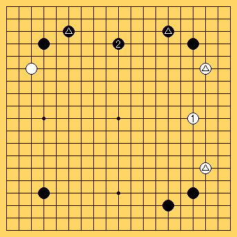 冷静に形勢判断をして見ると、 と の富士山型はほぼ互角。隅はどうなっているのか?隅は黒が1ヶ所に対して白は3ヶ所取っている。 |
