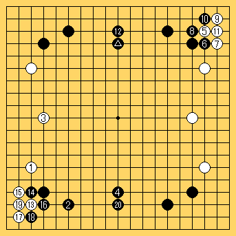 形勢はどうか?上辺の黒地は少なく見積もって40目。左辺の白地は多く見積もっても30目と言うところかな?下辺と右辺も同じ形なので現在は黒が20目リードしていると言う訳。 |