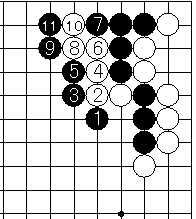相手の石が三線に来た時、二線から押して節をつけシチョウにして取る。7と一回曲げるのがポイントで、これで11までで召し取れる。