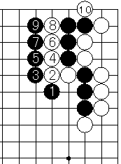 前図黒7でそのまま押していってしまうと黒9の後に白10で左方の黒4子が取られてしまうので失敗する。