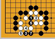 まず黒1とキリ、白2に黒3と置きます。白4に黒5と出て、白6の後、黒7が妙手です。
