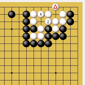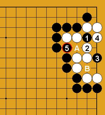白は5に打つことができない。白4と黒一子取れば、黒5でAとBのウッテガエシが見合いで死です。