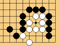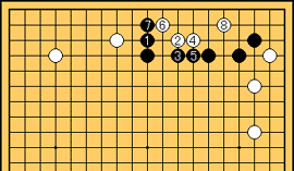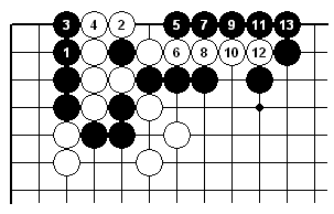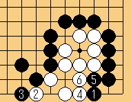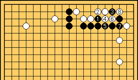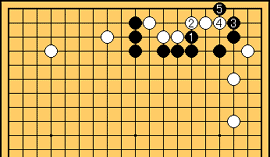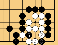白2押え、黒3下がり、白4ブツカリ、黒5ハネ。