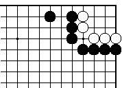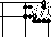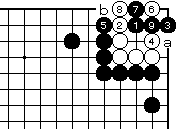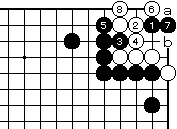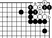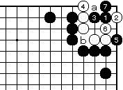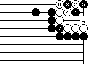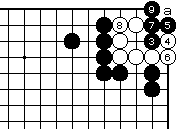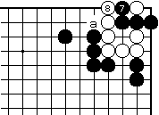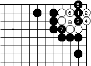 白2に黒3でも黒7まで、いずれ白 がaとツグ形は三目中手で白死です。 |