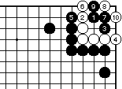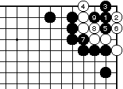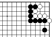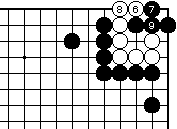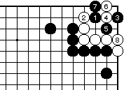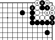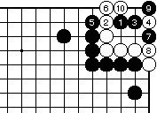 最初に黒1とハネて、白2に黒3と 置いてもよい。これまでの図と同様 の手順で黒9まで、白死です。 |