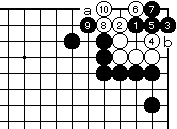 (白の失敗図) 前図の白4でハネるのは黒9まで、 この後白が攻め合いにいっても黒a に打たれれば四目中手で、攻め合い 以前に白死です。 |