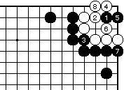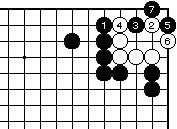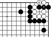 第70-1図の黒7でここに曲がれば、 白8と引いて万年コウです。 (第62-3、4図参照) 黒は1手ヨセコウにするか、この図 の万年コウにするかを選択できます。 |