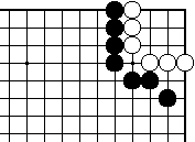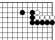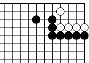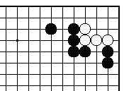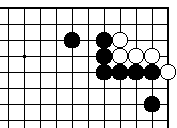 (参考図1) 前図で黒1を決めることもできます が、白の外ダメが2つ以上あれば攻 め合い白勝ちです。 |