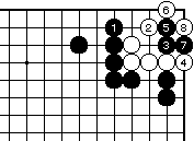 (黒の失敗図2) 最初に黒1と下がるのは白2と受け られてコウにもならず、白8まで生 きます。 |