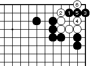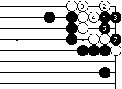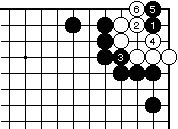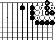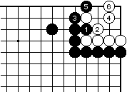 (黒の失敗図1) 黒1白2に黒3と押さえ、白4に黒 5と当てても白6とかわされて白生 きており、黒失敗です。 |