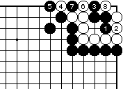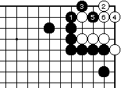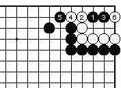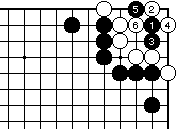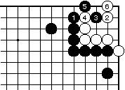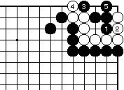 白2の曲りには黒3から5で前図と 同様の結果になります。なお外ダメ がある場合はこの手順に限ります。 |