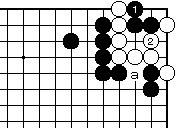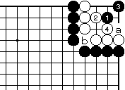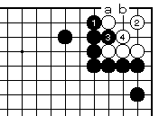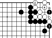 (参考図) 外ダメの無い場合白2の突き当りは、 黒3の妙手でコウになってしまいま す。白4には黒aです。 白4でaとすると黒bで白死です。 |