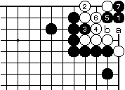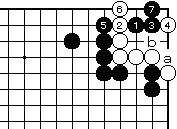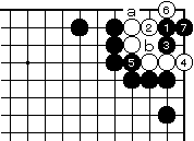 黒1白2に、黒3とのぞいてから5 と押さえれば黒7まで、aとbが見 合いで白死です。 |