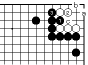 黒1に白2と引くのは黒3と押さえ ていて白に生きはありません。 この後、白aには黒bです。また、 白cとしても隅の七目第一型となり 白死です。 |