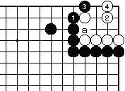 (黒の失敗図2) 最初に黒1と押さえ、白2に黒3と ハネても白4で、前図と同様に白生 きています。 なお、白4で3の右に押さえると、 黒aでコウになります。 |