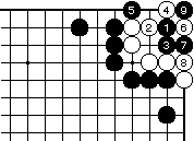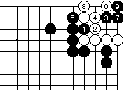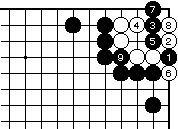 黒1、3から5と押さえ、白6に黒 7と下がって黒9まで、万年コウで す。 |