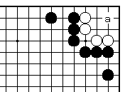 (参考図) こちらの外ダメがある時は白4とし て、黒5に白6まで白生きです。 なお白4で6とすると、黒aと打っ てヨセコウになるので白失敗です。 |