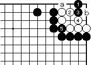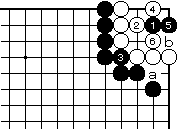黒1から3の飛びに対して白4はし かたない。ここで黒5に押さえ、白 6なら黒7から9まで。この後白a には黒bで目有り目無しの白死です。 |