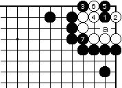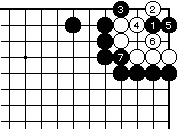 (参考図1) 前図の黒3をハネるのは、白4から 黒7までセキとなり黒失敗です。 |