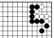 第83図「両下がりのある時」 (外ダメ2つ以上) 黒先でも白生き この型の外ダメは、片方の下がりに 外ダメ2つ必要です。両方の下がり に外ダメ1つづつはセキです。 |