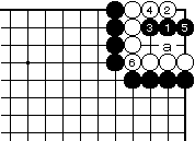 (前図の続き) 前図の後、黒1と押さえて攻め合い をねらっても、白2と当て、黒3と 2子を取った時、白4から6で隅の 黒2子が追い落としで、白生きとな ります。 |