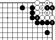 黒1に白2とツケ、黒3に白4と突 き当たって、黒5から7でコウにな ります。第78図と異なり、コウは白 の取り番です。 白4で7は黒4で、第78-3図と同様 の形となり白死です。 |