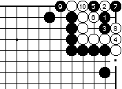| 3/ノビ、4/ハネ。5/押え。6/ツギ。7/ハネ。8/ダメ詰め。9/黒1子抜き。10/ダメツメ押え。白にダメが1つあり、しかも下バネのある場合は、黒2から10までと二手ヨセコウになる。 | |