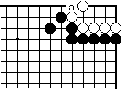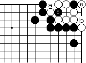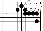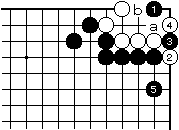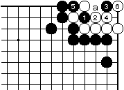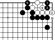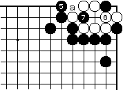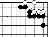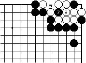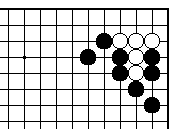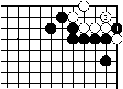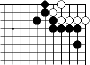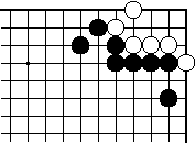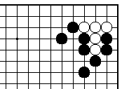 | 【隅の7目カケツギ形の変化形元図】 (2のカケツギ&下がりあり&外ダメ空きあり) (カケツギ側サガリに生き側が手を抜いた形) |