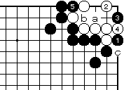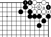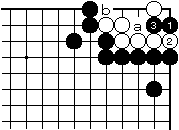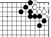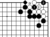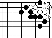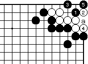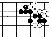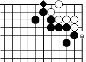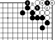 | 黒のハネに白1(2の1)に受けるのは生きているが、下図の通り黒aの下がりが利く。 | |