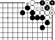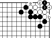 | 上図黒aの下がりに手抜きすると、黒1と置き、白2、黒3で白aなら黒b、白bなら黒aでダメづまりの白死。 |