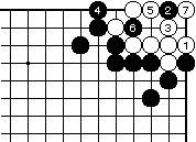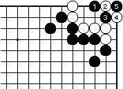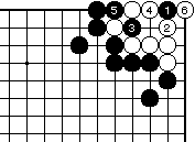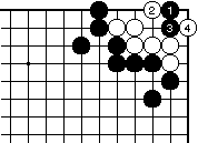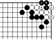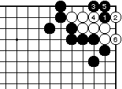 | 白2ハネ、黒3コスミ、白4突き当り、黒5ツギ、白6で生き。 | |