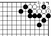 | (白の失敗図) 黒のハネに白1と付き合うと黒2とツケられ、白a、黒b、白cでコウ。なお白aでcは黒aで白死。 | |